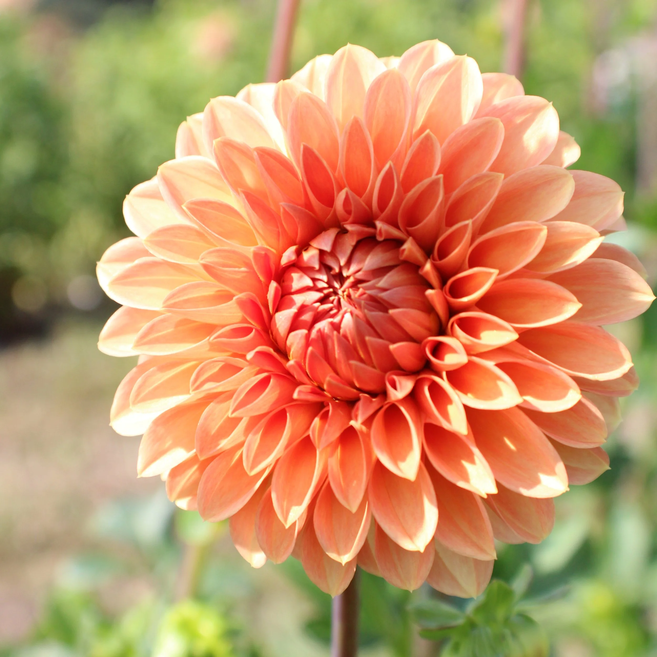 This dahlia grows great in any garden. It has long, tall stems which are an attractive color and size. What I love most about Mission Gingersnap is that the 4” formal decorative flowers usually grow a cute light green “button” at the center of the flower. This gives blooms a whimsical and wild feel, adding dimension to any arrangement I make with it. The coloring is orange and coral but tones are muted enough to ensure it arranges with many other flowers.
